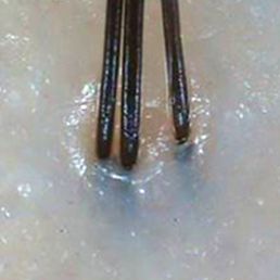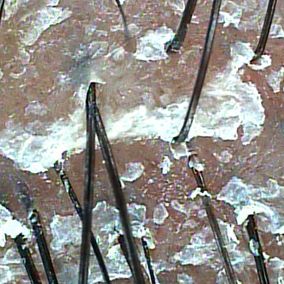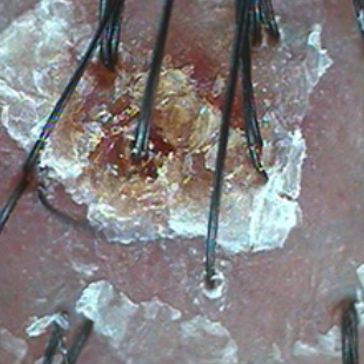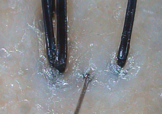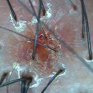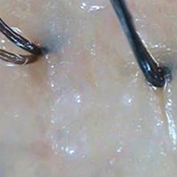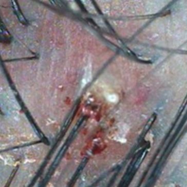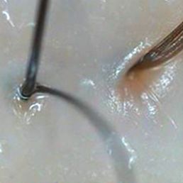 옅은 살색에 건조하지 않고 유수분 밸런스가 잘 유지됩니다. 모발은 1~3개가 굵은 다발로 관찰됩니다.